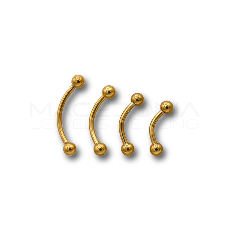Luminoso e raffinato, la nostra banana in acciaio chirurgico 316L colore oro è decorata con palline per un tocco elegante e distintivo. Disponibile in diverse misure, è resistente, ipoallergenica e versatile, perfetta per eyebrow, rook, daith, lobo e helix.