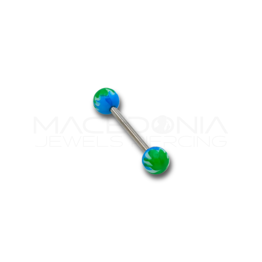 Un barbell resistente e originale, ideale per chi desidera un gioiello audace e distintivo. Realizzato in acciaio chirurgico 316L, ipoallergenico, le palline con fantasia a fiamme verdi e blu aggiungono dinamismo e personalità al tuo look.