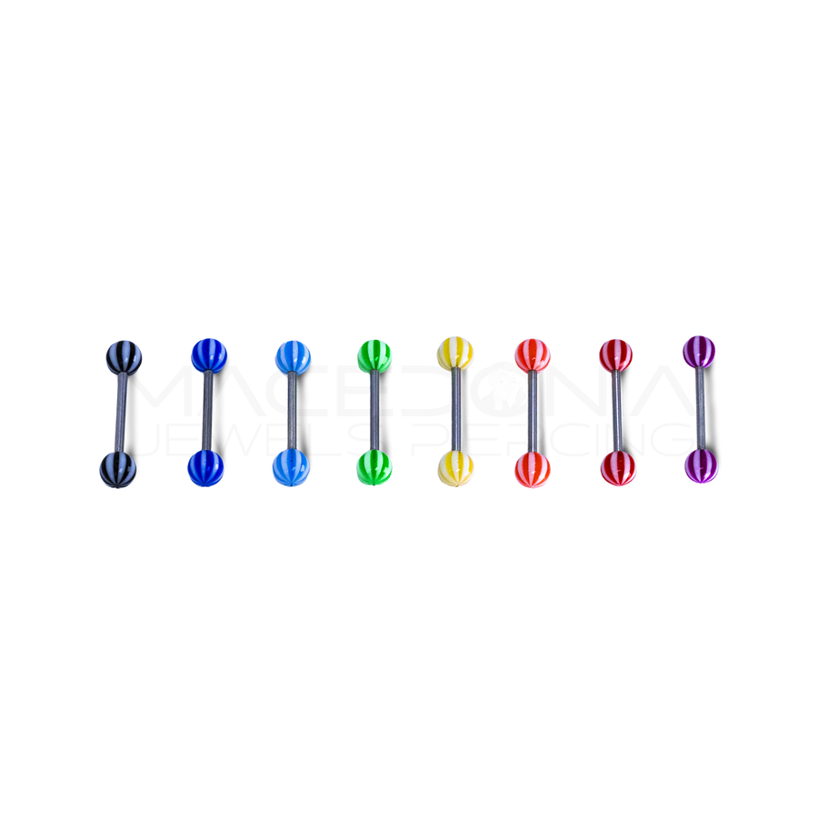 Un barbell originale e stiloso, ideale per chi cerca un gioiello sicuro ma con un tocco di personalità. Le palline a strisce da 6 mm conferiscono un effetto unico, rendendolo perfetto per il piercing a lingua e capezzoli.