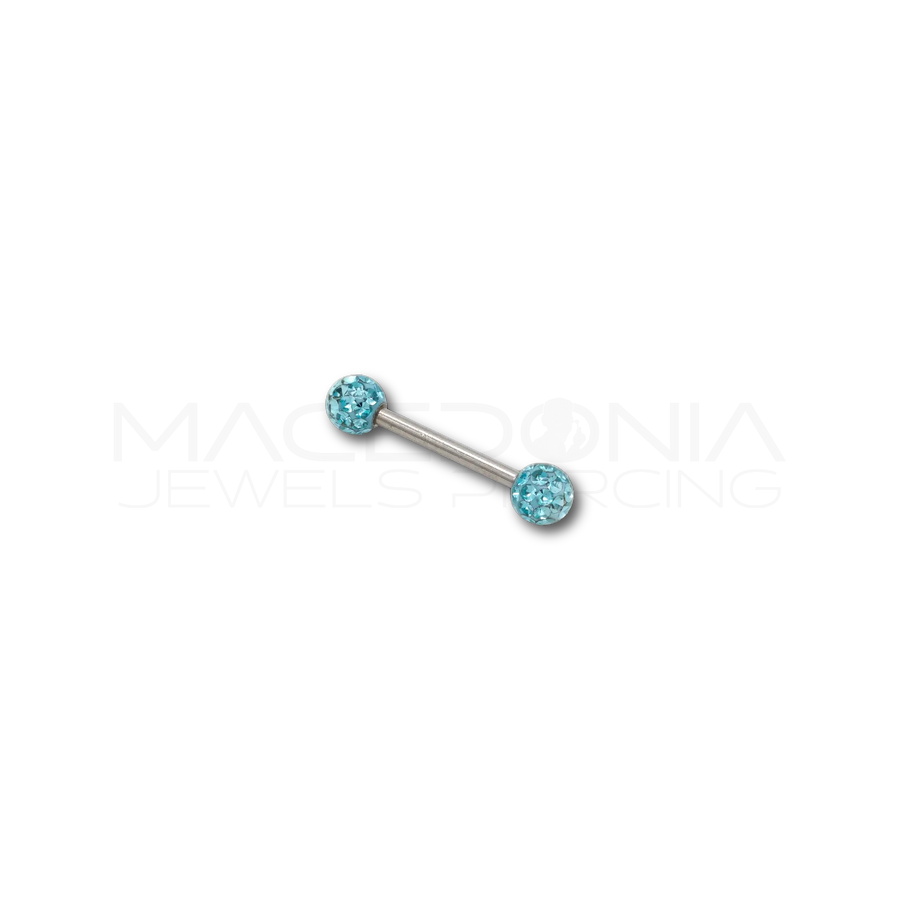 Un barbell brillante e resistente, ideale per chi desidera un gioiello sicuro e dallo stile originale. Perfetto per piercing a lingua e capezzoli, le palline glitterate da 5 mm aggiungono un tocco luminoso e personale.