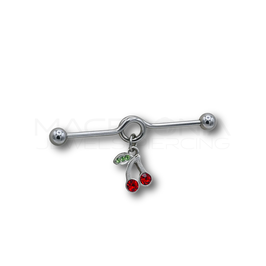 Un gioiello originale e luminoso che unisce eleganza e freschezza. Questo barbell ad anello, realizzato in acciaio chirurgico 316L, è impreziosito da un brillante zircone a forma di ciliegia e da palline da 5 mm, per un look delicato ma di grande impatto. Ideale per chi vuole dare un tocco vivace e raffinato al proprio piercing industrial.