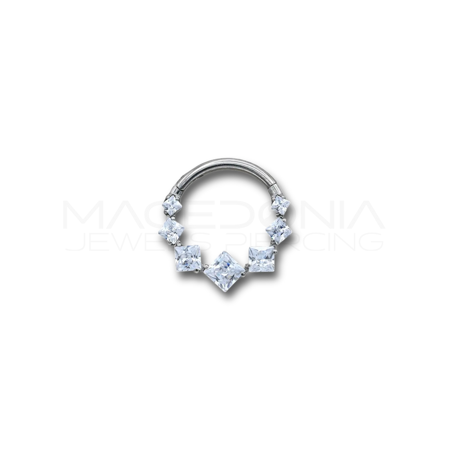 Piercing con chiusura clicker in Titanio F136 (il top per sicurezza e hypo), colore argento, impreziosito da rombi di zircone che creano una luce definita e moderna. La brillantezza non è pacchiana: è pulita, precisa, elegante.