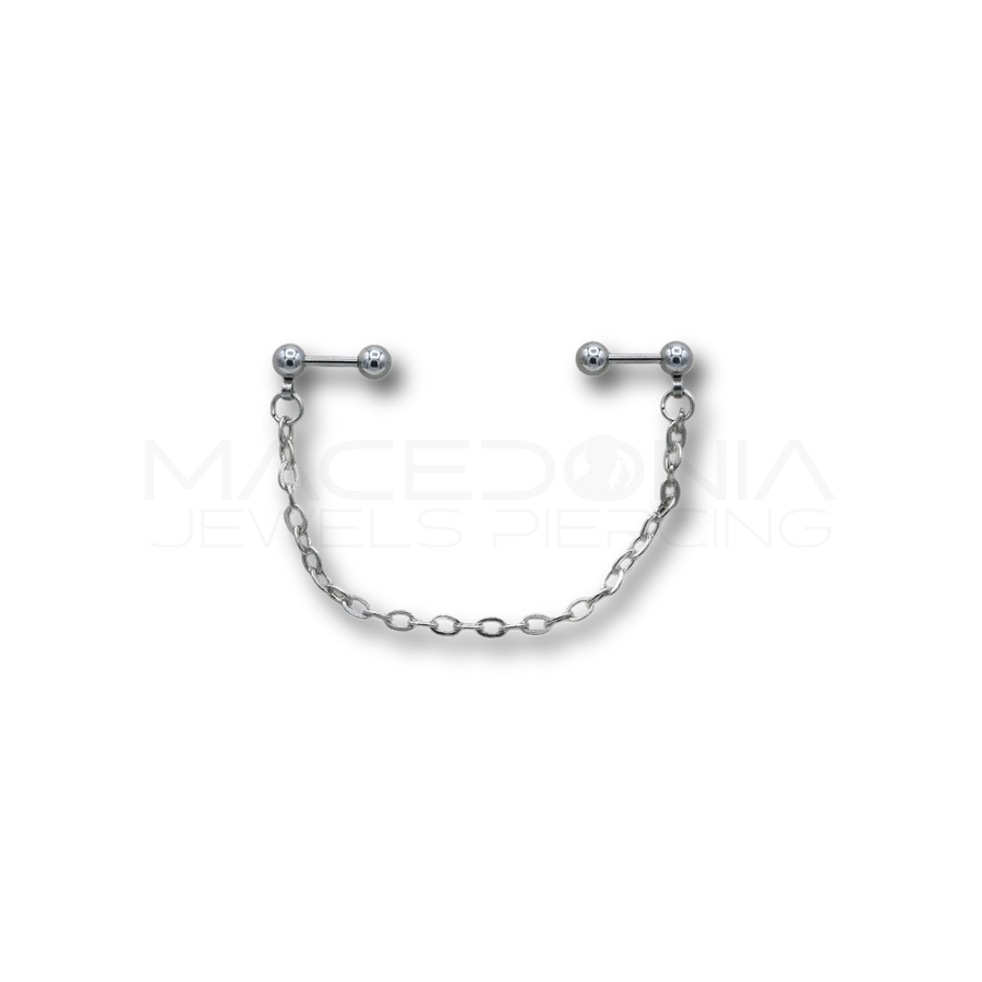 Aggiungi un tocco audace e contemporaneo al tuo stile con questa coppia di barbell realizzati in acciaio chirurgico 316L, ipoallergenico e resistente. Sono uniti da una catena decorativa della lunghezza di 7 cm, combinando estetica distintiva e durabilità.