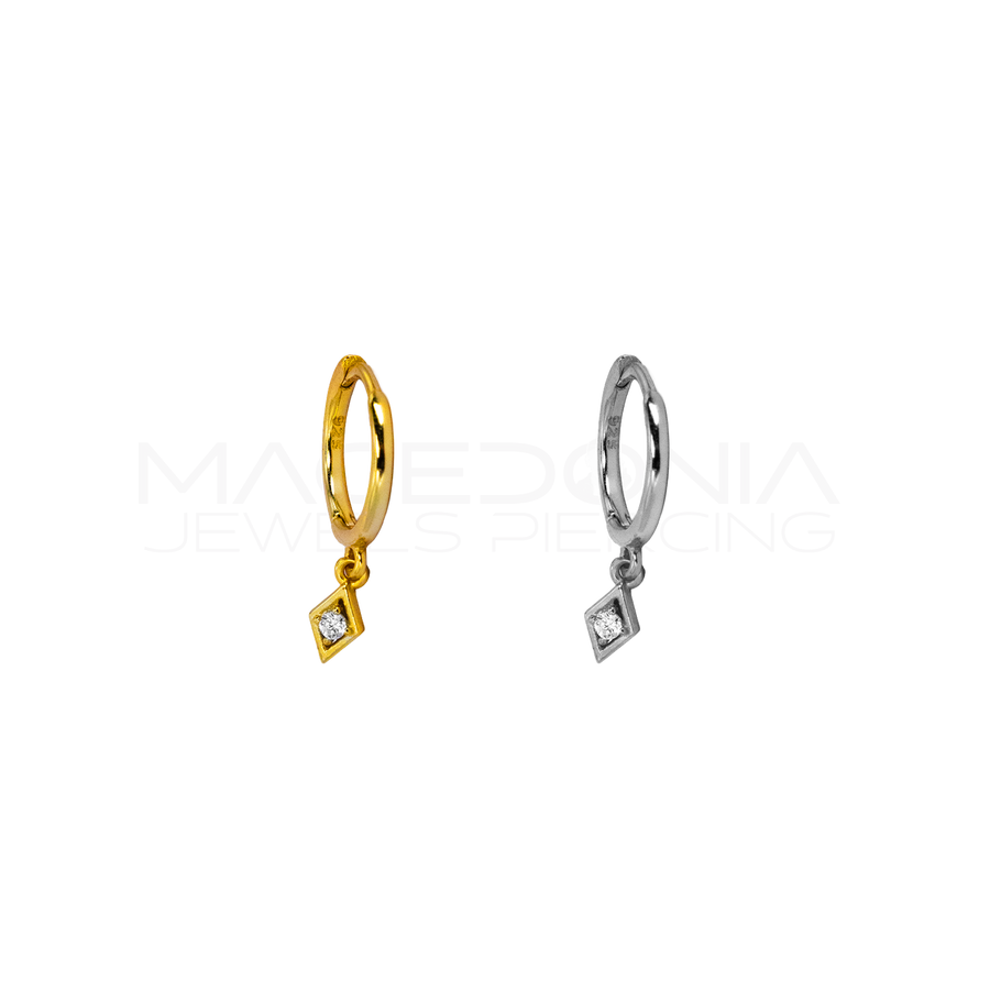 Orecchino in Argento 925 con chiusura clicker, disponibile nelle finiture argento o oro, dotato di ciondolo a forma di triangolo con zirconi. Disponibile in diverse colorazioni. Perfetto per lobo e helix.