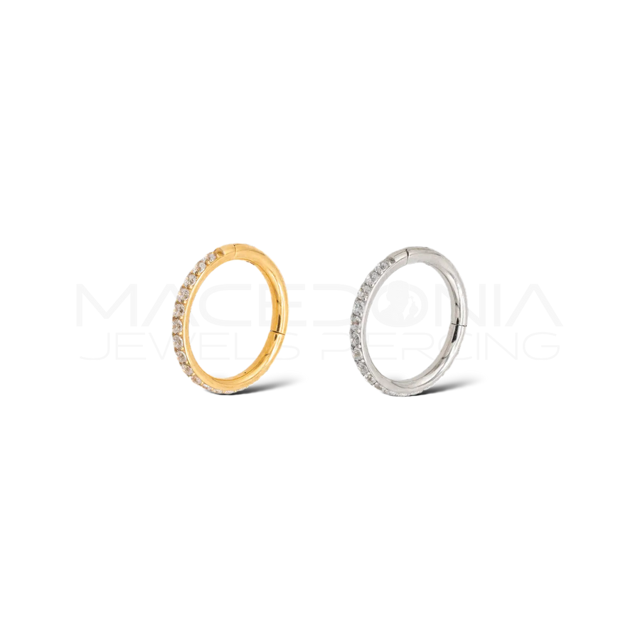 Elegante e luminoso, questo piercing a cerchio in acciaio chirurgico 316L presenta una chiusura clicker pratica e sicura e zirconi incastonati bianchi, disponibili anche in diverse colorazioni. Perfetto per lobo, helix, septum, daith, forward helix, labbro, conch e tragus, disponibile in varie misure per adattarsi a ogni stile.