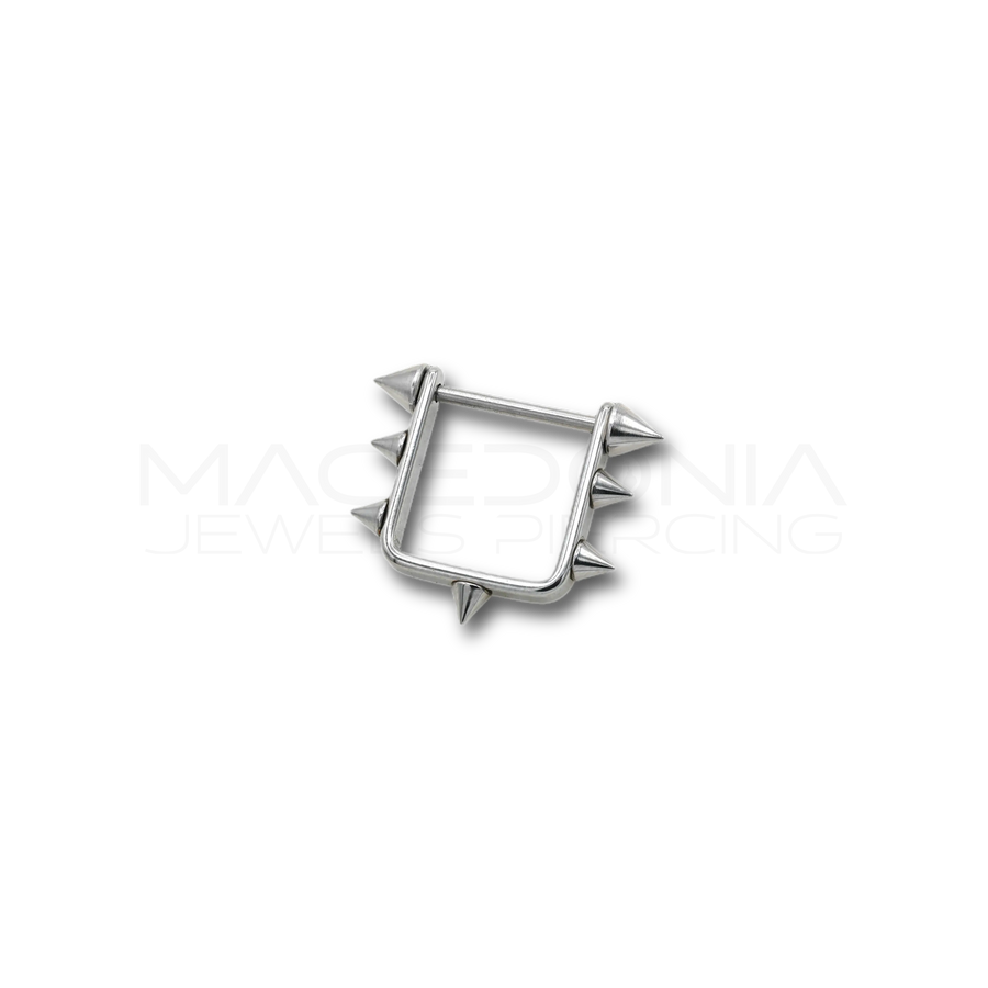 Dallo stile audace e originale, questo piercing è realizzato in acciaio chirurgico 316L colore argento, ipoallergenico e resistente. Il design combina una staffa quadrata, punte decorative e due bilancieri a forma di cono, per un look unico e distintivo.